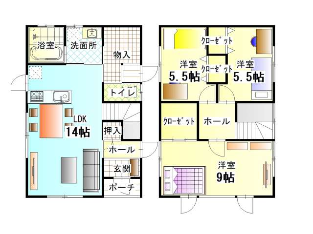 | 詳細間取 | 3LDK (2階:洋5.5帖×2、2階:洋9帖×1、LDK14帖) | ||