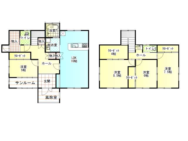 | 詳細間取 | 4LDK (2階:洋8.5帖×1、1階:洋7.5帖×1、2階:洋6帖×1、2階:洋5帖×1、LDK16帖) | ||