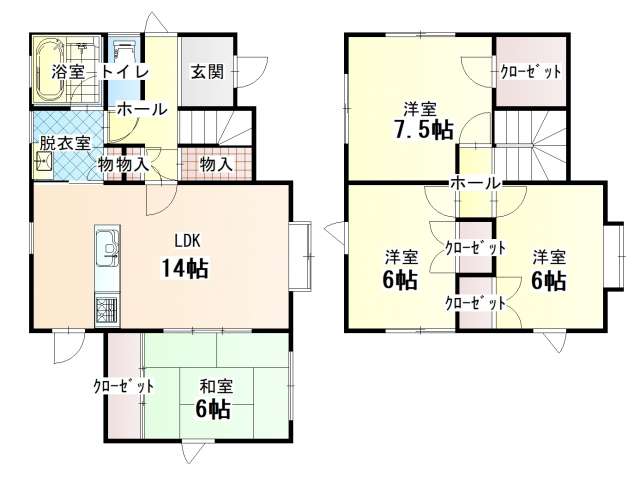 | 詳細間取 | 4LDK (2階:洋6帖×2、2階:洋7.5帖×1、1階:和6帖×1、LDK14帖) | ||