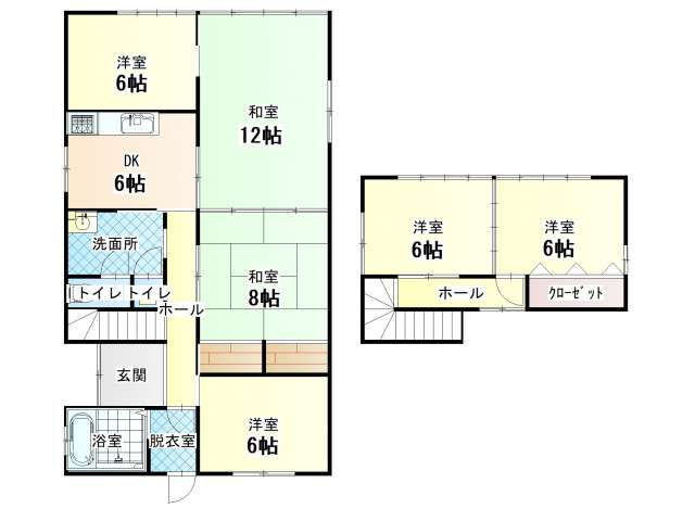 | 詳細間取 | 6DK (1階:洋12帖×1、1階:洋6帖×2、2階:洋6帖×2、1階:和8帖×1、DK6帖) | ||